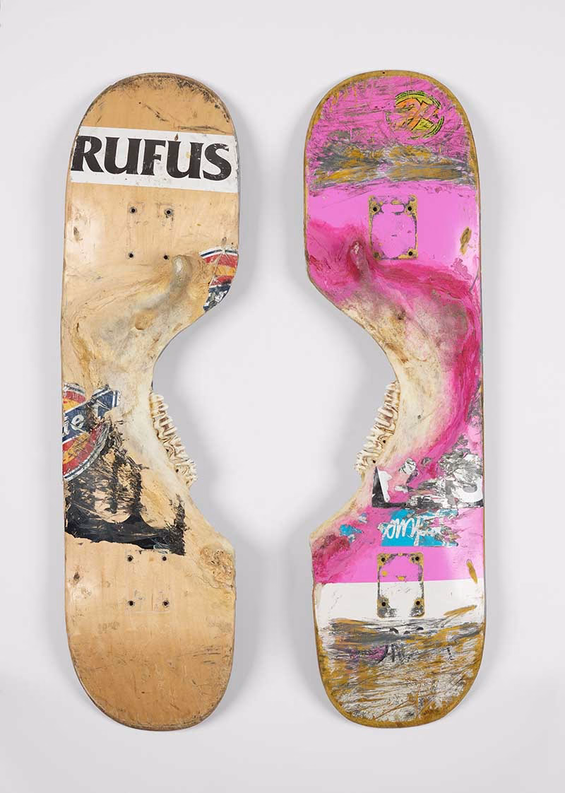Emanuele Resce (1987, Milano’da yaşıyor ve çalışıyor), kaykay tahtasının içine yerleştirilmiş sığır çene kemiğinden oluşan bir eser sunar. İnsan müdahalesiyle şekillenen gündelik yaşam nesnesiyle, sıklıkla teknolojik modernliğin karşıtı olarak kurgulanan hayvansal dünyaya ait bir fragmanın buluştuğu bu nesne, melez bir forma dönüşür. Peki modernlikten kastımız tam olarak nedir?