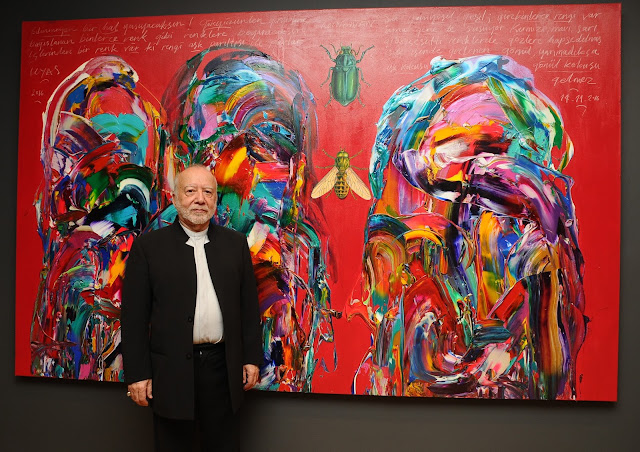 | Ergin İnan “Üçlü Yüz” tablosuyla. “Üçlü Yüz”, 2016, tuval üzerine akrilik ve yağlıboya, 180 x 290 cm., İmzalı. |