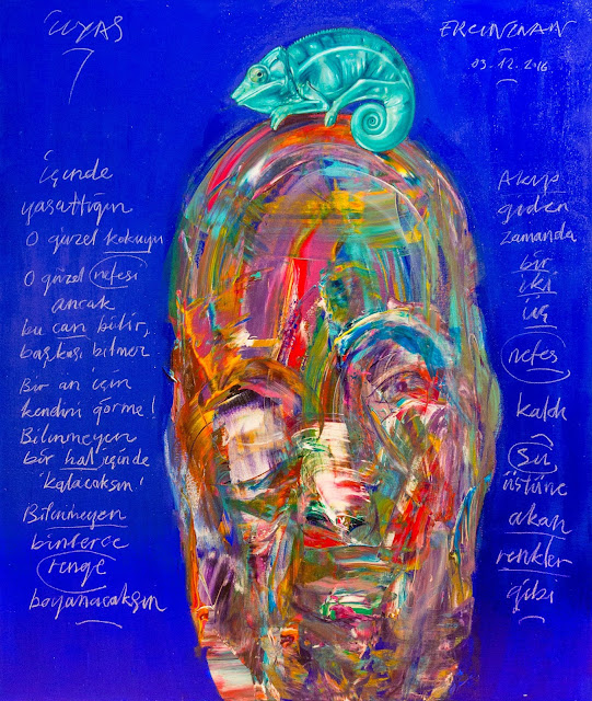 Ü.K.- Ergin İnan dediğimiz zaman gözümüzün önünde çok net bir tablo oluşur. Bu özgün üslubu yakalamak da her sanatçıya nasip olmaz. Tablolarınızda, desenlerinizde genellikle grotesk figürlerden oluşan desenler, böcekler, yazılar ve soyut-metafizik öğeler görürüz. Aslında bu buzdağının görünen yüzü değil mi? Ergin İnan’ın sanatı nelerden beslenir?