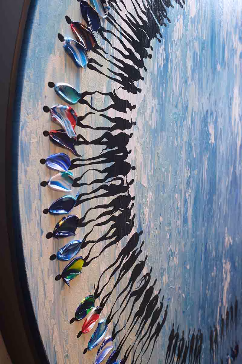 Requiem For Shadows’daki figürler, her biri tekil olan güçlü palet bıçak darbeleriyle varlık kazanır. Bedensel formlar, aşkı, özlemi, hatıraları ve görülme isteğini ışığa taşırken, insan kimliğinin değişken ve kırılgan doğasını yansıtır. Arkadaki derin gölgeler ise bastırılmış duyguları, söylenmemiş hayalleri ve gizli iç dünyaları saklar. Işık ile gölgenin karşılaşması, insan varoluşunun çok katmanlı yapısını görünür kılar; hepimizin taşıdığı hikayelerin sessiz bir ağıdına dönüşür. Requiem For Shadows, izleyiciyi yalnızca görmeye değil, hissetmeye davet eder.
