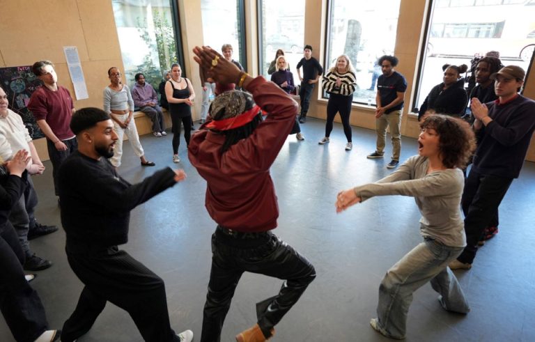 Üyeler sınıfta ısınıyor, Ulusal Gençlik Tiyatrosu (Kuzey Londra), Nisan 2025, (© Japonya Sanat Derneği / Sankei Shimbun).