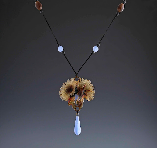 | Exhibitor: A. Aardewerk Antiquair. Juwelier b.v., Artist / Title: Art Nouveau pendant ‘Poppies’, Horn, silk and coloured glass, Size?, Signed ‘GIP’ for Georges Pierre, France, circa 1910 |
