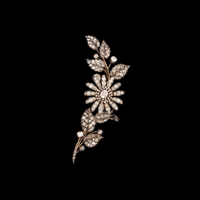 | Exhibitor: A La Vieille Russie, Inc, Artist / Title: Old-mine floral spray brooch, Diamonds mounted en tremblant and set in silver and gold, total circa 16 crts, Length 11.4 cm, France, circa 1870 |