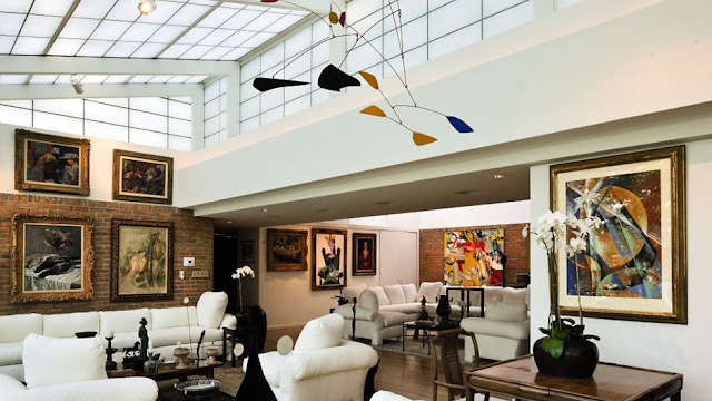 | Taubman, a trained architect, made several changes to the house to make it more hospitable to the large-scale works he was acquiring. He expanded the common areas and introduced skylights so there was natural light. Unusual for a collector of his magnitude, Taubman was his own curator and arranged the art in his home, often mixing works from different periods and styles. In the living room, a Calder mobile hangs above paintings by a diverse array of artsits, including Picasso, Degas, De Kooning and Balla, Photography © Steven Brooke Studios. |