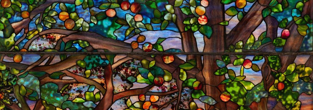 Danner Anıt Penceresi, Louis Comfort Tiffany ve Agnes Northrop’un sanatsal işbirliklerinin zirvesindeki dehasının bir kanıtı olarak duruyor. Bu nefes kesici cam yaratımı, canlı renklerin ve karmaşık ayrıntıların bir senfonisi olup neredeyse rüya gibi bir sahneyi hayata geçiriyor. Tiffany Studios’ta çığır açan ve vitray tasarımı alanında öne çıkan birkaç kadından biri olan Northrop, parçaya doğanın güzelliğinin ve ışığının özünü yakalama konusundaki eşsiz yeteneğini aşıladı. Pencerenin kompozisyonu bir denge ve hikaye anlatımı şaheseridir. Görkemli, meyve yüklü ağaçlar, batan güneşin sıcak renk tonlarının altında kıvrılıp parıldayan dolambaçlı bir nehrin üzerinde zarif bir kavis çiziyor. Parıldayan kehribar ve koyu mavi katmanlarla boyanmış gökyüzü, ışığını hayatla nabız gibi atan bir manzaraya yansıtıyor. Gün ışığının son ışınlarıyla benekli parlak kırmızı gelinciklerden oluşan bir alan, canlı bir kontrast ve hareket dokunuşu ekleyerek sahnenin sürükleyici kalitesini artırır.