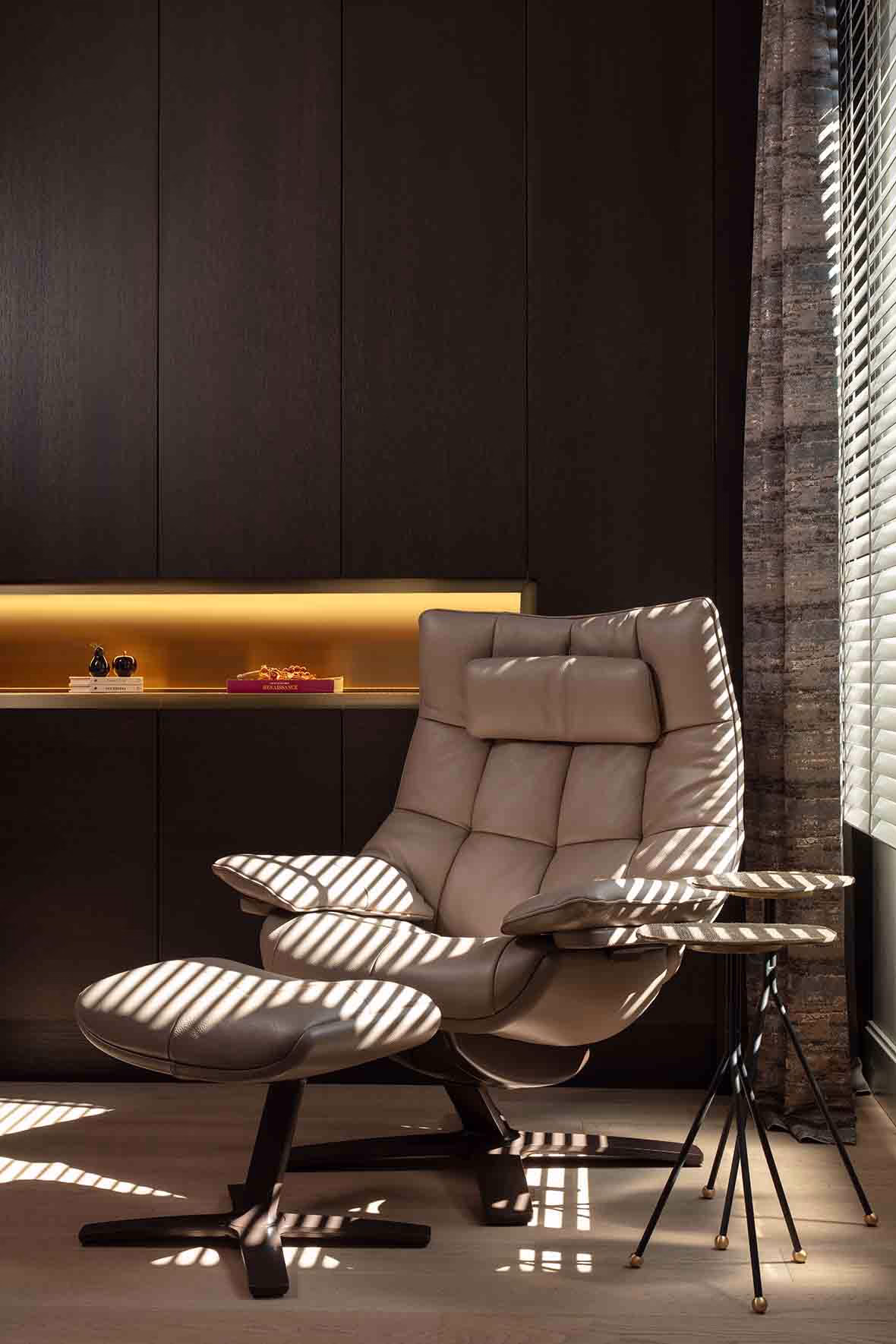 Yatak odasında özel bir dinlenme ve çalışma alanı yaratılmış ve Natuzzi marka koltuk, Four and More marka sehpa seçilmiş.