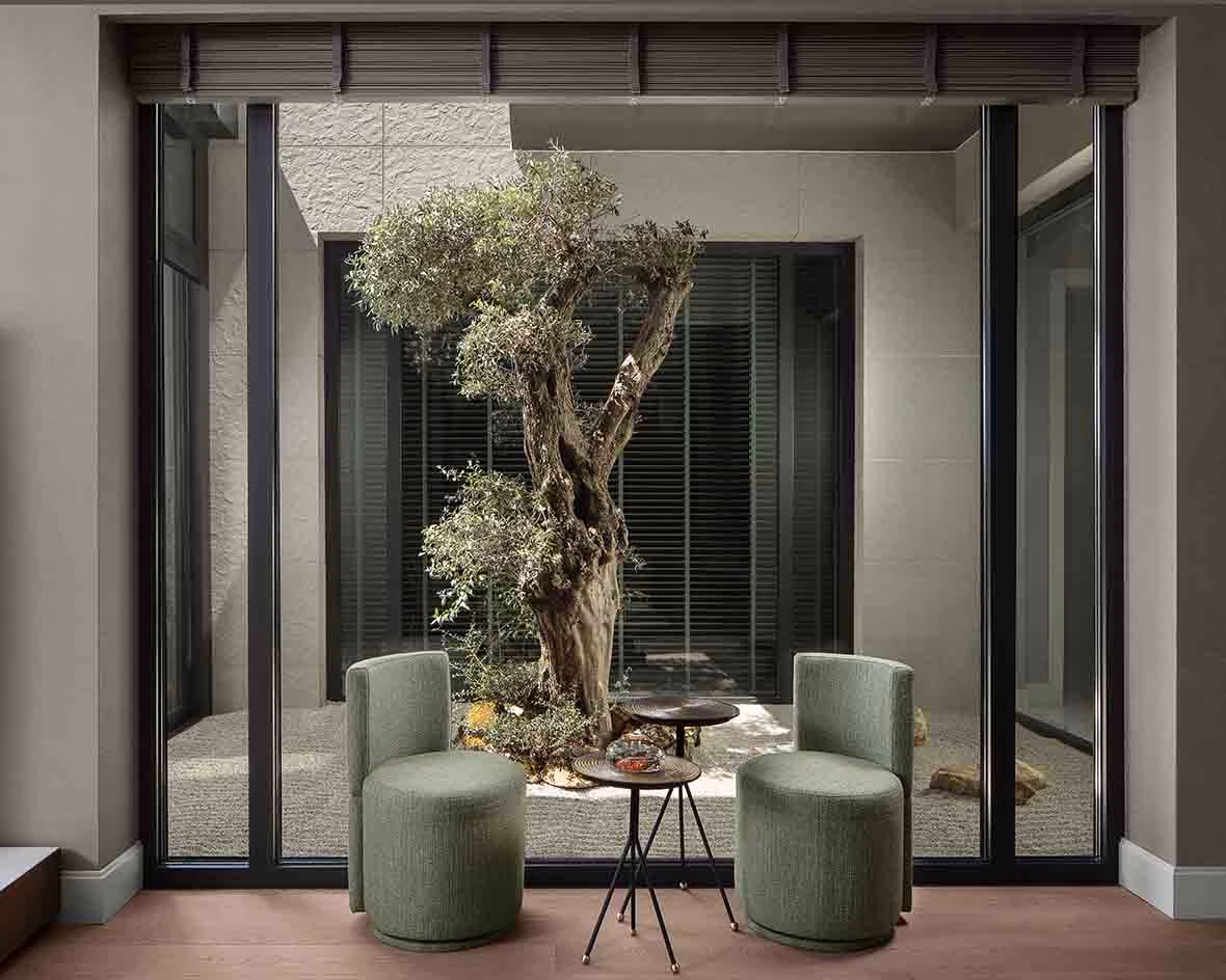 Holdeki zeytin ağacıyla hoş ve samimi bir bütünlük sunması amacıyla Four and More markasından yeşil tekli koltuklar ve ikili sehpa tercih edilmiş.