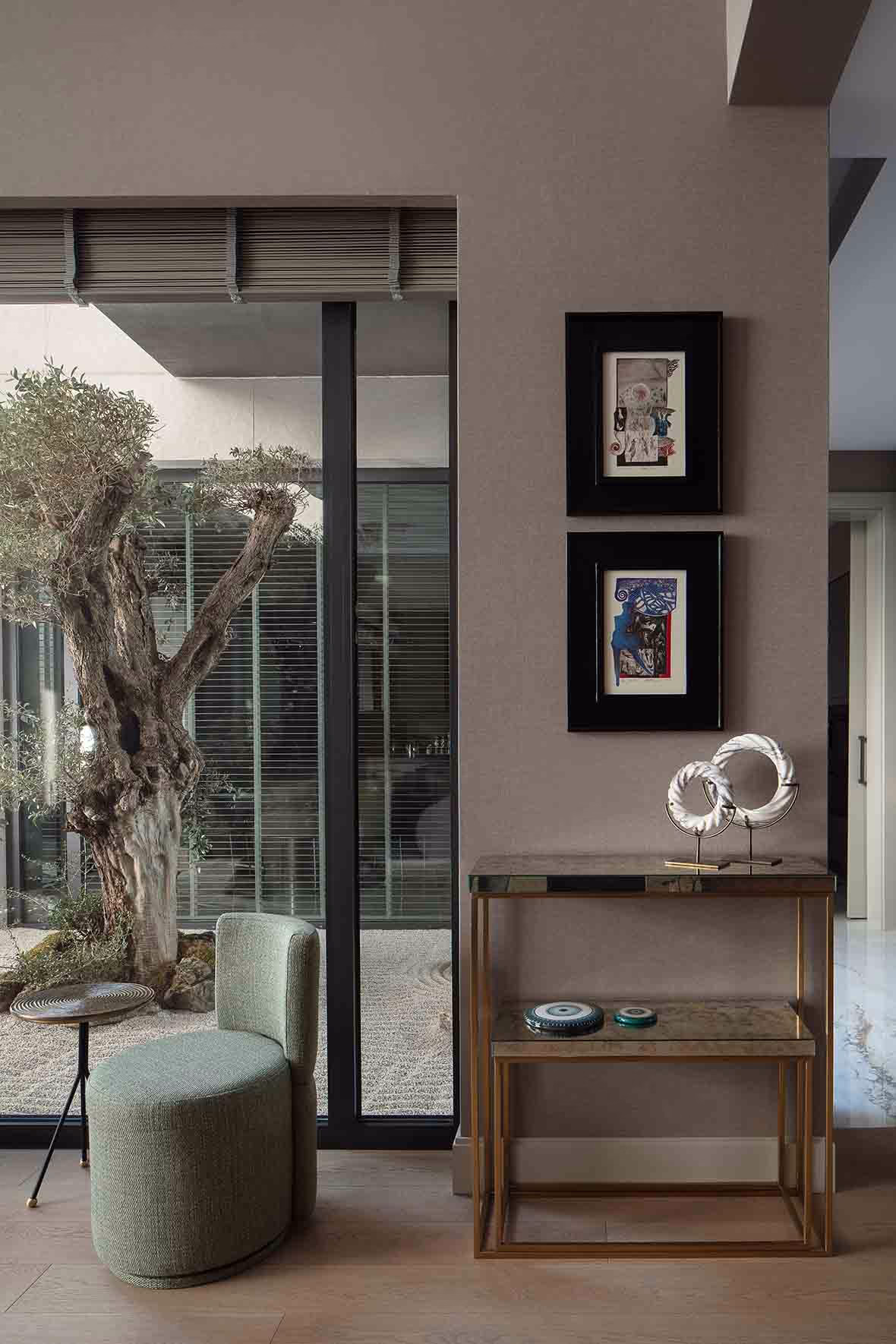 Evin en önemli ilham kaynağı ve değerli odak noktası ise giriş holünde yer alan zeytin ağacı. Zeytinin bilgeliği, sakinliği ve asaleti, projenin tüm tasarım dilini ve hikayesini şekillendirmiş.